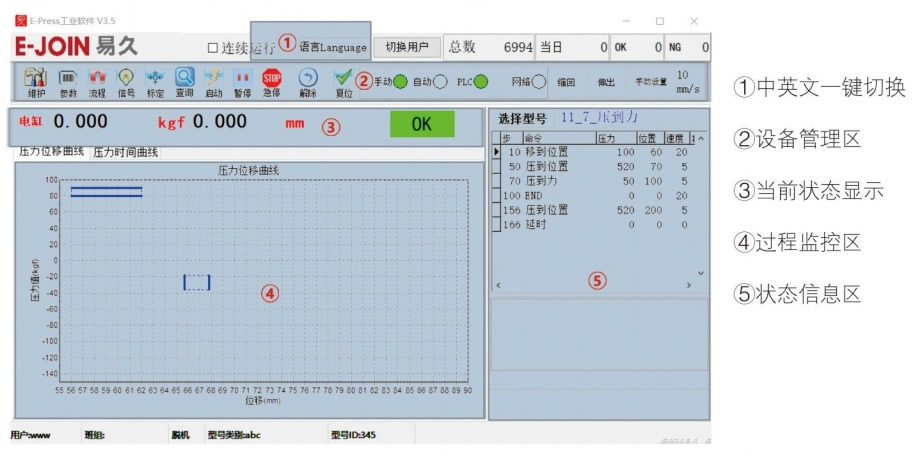 數(shù)據(jù)采集頻率20KHZ,采集精度24bit,可存儲(chǔ)500萬條以上壓裝曲線,E-press 工業(yè)軟件支持二次開發(fā)。